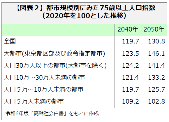 一方、この超高齢化は地域によって状況がまったく異なります。図表2は2020年を基準年として2040年と2050年の人口指数を都市規模別にみたものです。