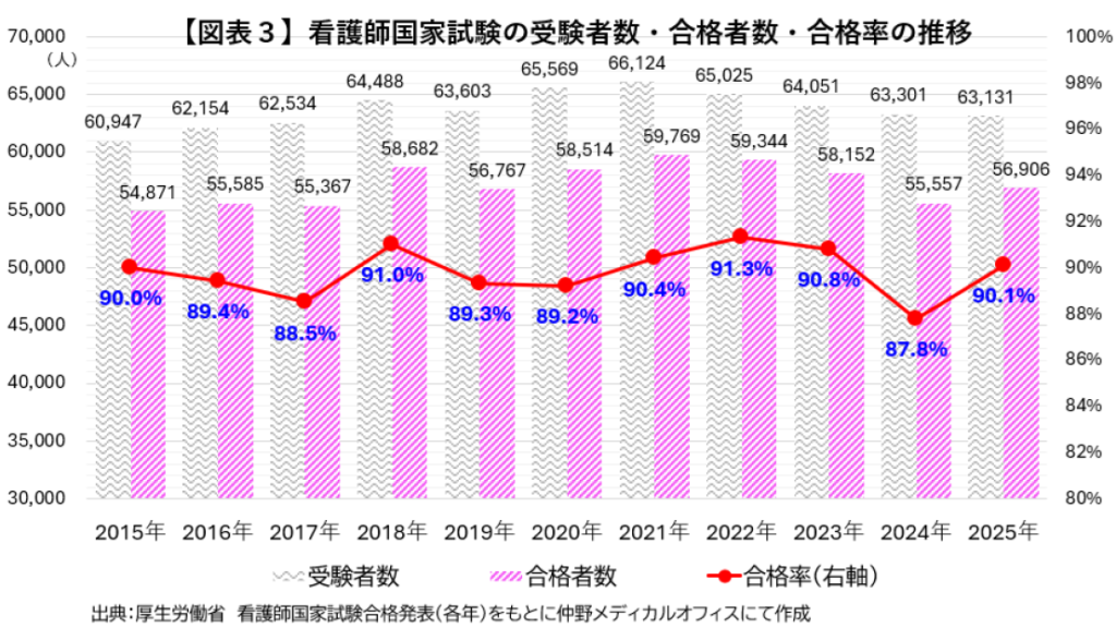 図表3は、看護師国家試験の受験者数と合格者数、合格率の推移をグラフにしたものです。
